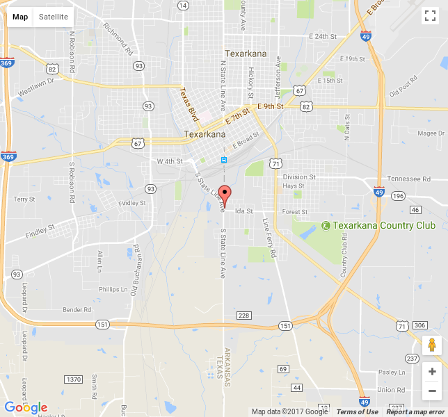 If entering Texarkana from either the north, west or east, proceed south on State Line Ave. to Fourth Street. Proceed west on Fourth to the Texas Viaduct. We are located at the south end of the Texas Viaduct at South State Line and Ida Streets. Or, entering from the west on I-30, turn south on Loop 151 to South State Line exit. Turn north (left), proceed to South State Line and Ida. Approximately 2 miles. Likewise, if entering from the east on I-30, turn south on Loop 245, proceed to South State Line exit. Turn north (right) proceed to South State Line and Ida.